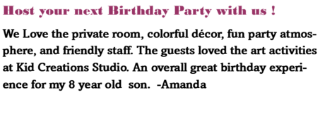 Kid Creations is a “create your own” Arts & Crafts Studio, Birthday Party Venue & Art Camp for kids ages 3-103.