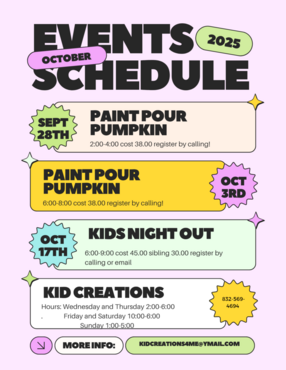 At Kid Creations Kingwood , we deliver the best Mobile Art Camps for Daycares, Corporate Events...The kids love to see us coming and we love what we do!