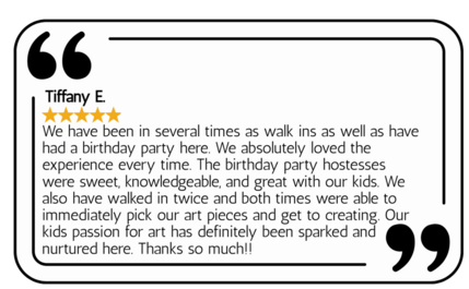 Our art parties are fun and done! All Party Packages include activity choice, a large private party room for 2 hours, fun party Hosts, printable invitations, colorful table covers, colorful generic cake plates, plastic ware, napkins, and a hand print canvas memento for the birthday kid.